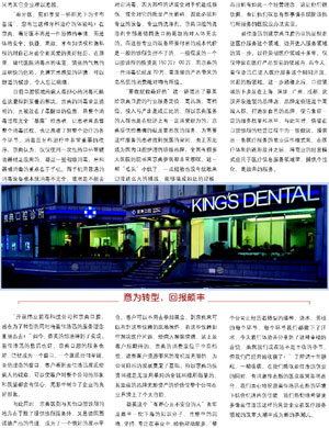 “要做就做最好的”這一語道出了蔡英給京典口腔的行業(yè)服務(wù)定位:高品質(zhì),高檔位。投入與產(chǎn)出是成正比的,所以京典服務(wù)的人群也是在經(jīng)濟上有一定承受能力的。京典提供給患者的就是高品質(zhì)的服務(wù),為需要這樣服務(wù)的患者找到就醫(yī)的空間,也正因此成為國內(nèi)口腔護理的品牌。全國有很多大醫(yī)院的院長來京典參觀都非常感嘆,這一幫“毛頭”小伙子,一點經(jīng)驗也沒有就敢來迎接這么大的挑戰(zhàn),能夠搞成如此的規(guī)模,而且能有如此一個經(jīng)營理念,這讓他們很欽佩,也讓他們嘆息有些事情在現(xiàn)階段他們所服務(wù)的醫(yī)院沒辦法實現(xiàn)。
