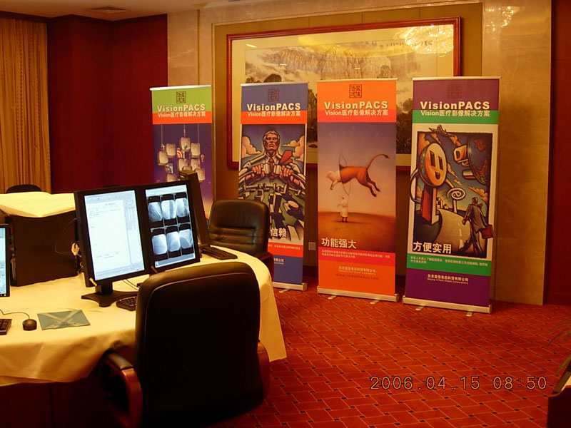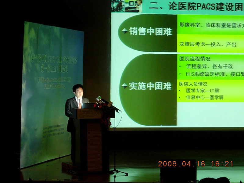 2006年4月15-17日,我公司參加了在北京鑫海錦江大酒店舉辦的第一屆中國PACS-RIS學(xué)術(shù)研討會暨第一屆IHE中國會議。公司預(yù)定了獨立的展廳,充分展示了目前VisionPACS/RIS的進展情況。技術(shù)部副經(jīng)理劉春來做了題為《感受PACS建設(shè)》的演講。該項工作對于提高盈佳浩迅公司VisionPACS/RIS的知名度,擴大公司影響,起到了積極的作用。