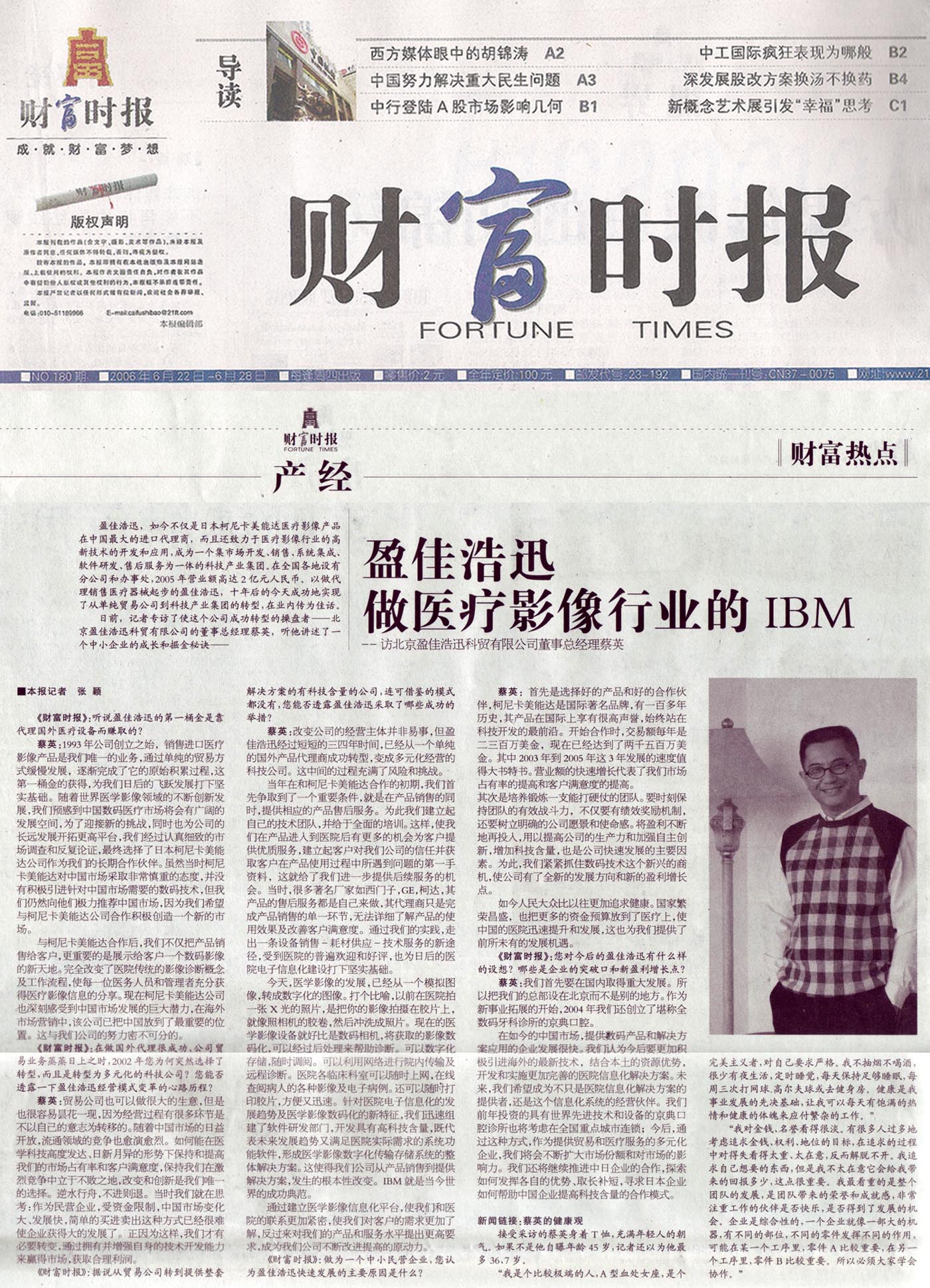 《財富時報》記者:張穎 盈佳浩迅,如今不僅是日本柯尼卡美能達醫(yī)療影像產(chǎn)品在中國最大的進口代理商,而且還致力于醫(yī)療影像行業(yè)的高新技術(shù)的開發(fā)和應(yīng)用,成為一個集市場開發(fā)、銷售、系統(tǒng)集成、軟件研發(fā)、售后服務(wù)為一體的科技產(chǎn)業(yè)集團。在全國各地設(shè)有分公司和辦事處,2005年營業(yè)額高達2億元人民幣。以做代理銷售醫(yī)療器械起步的盈佳浩迅,十年后的今天成功地實現(xiàn)了從單純貿(mào)易公司到科技產(chǎn)業(yè)集團的轉(zhuǎn)型,在業(yè)內(nèi)傳為佳話。